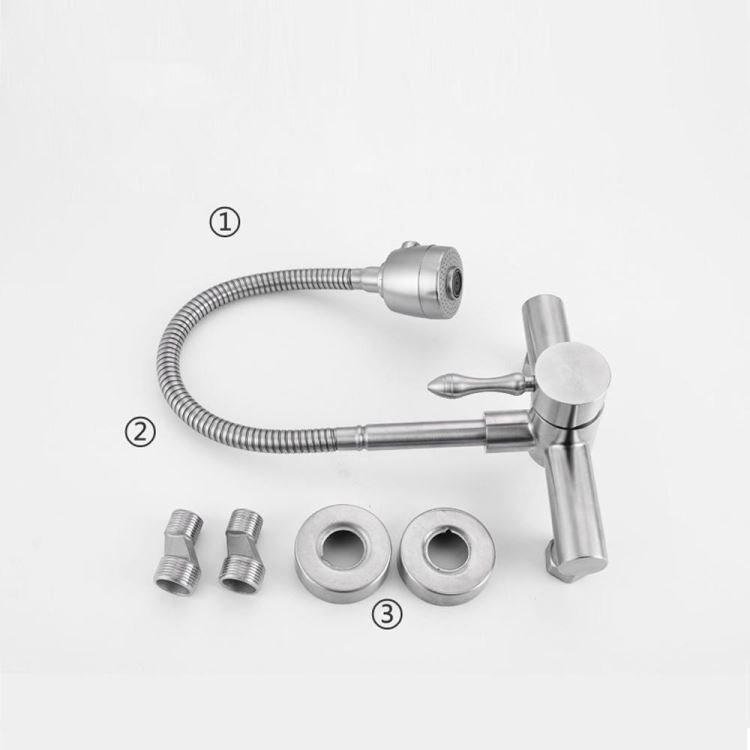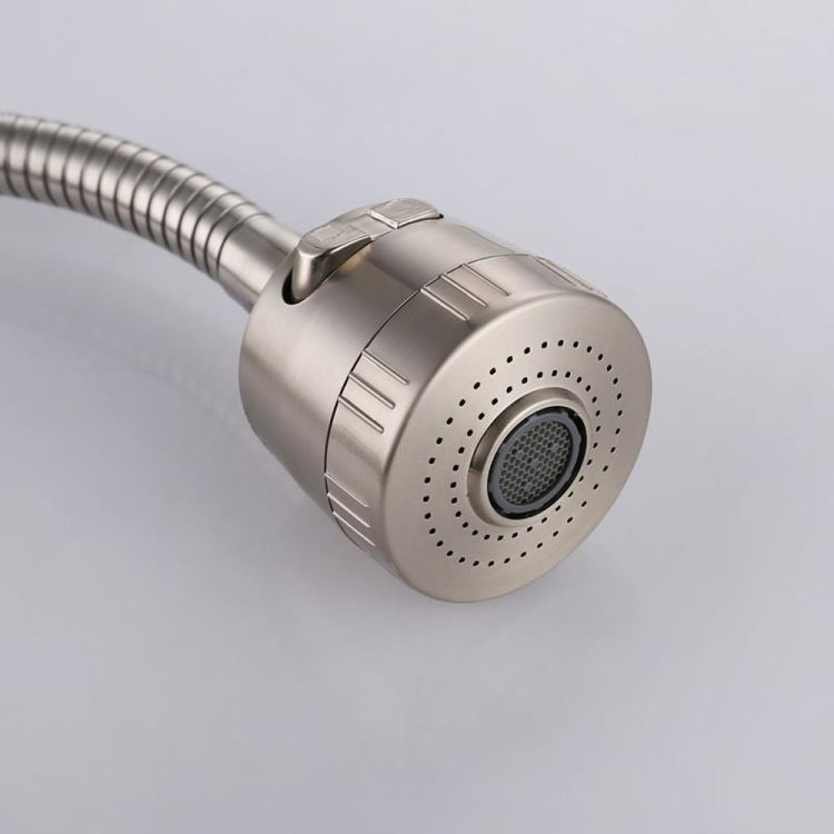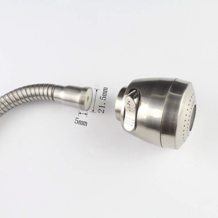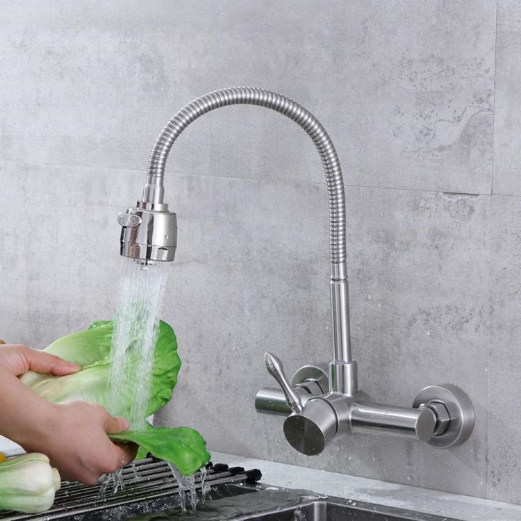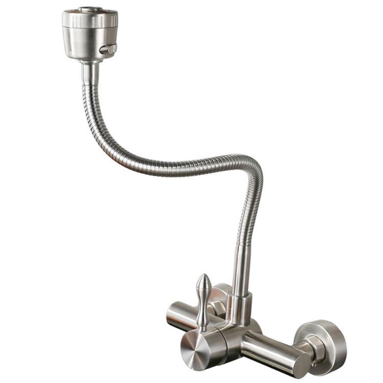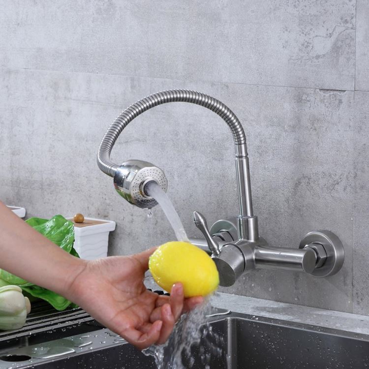 この蛇口はキッチン用壁付冷熱混合栓です。360度回転設計を採用しており、好きな角度に任意回転可能です。また、微細シャワーと整流の二つモード付き、注ぎ口の切り替えボタンを利用してモード切り替え可能です。ホースを自在に動けて、水流の方向を簡単に変えられますので、洗い物やシンクのお掃除などに便利です。シングルレバーは水流と水温を快適に調節することができます。