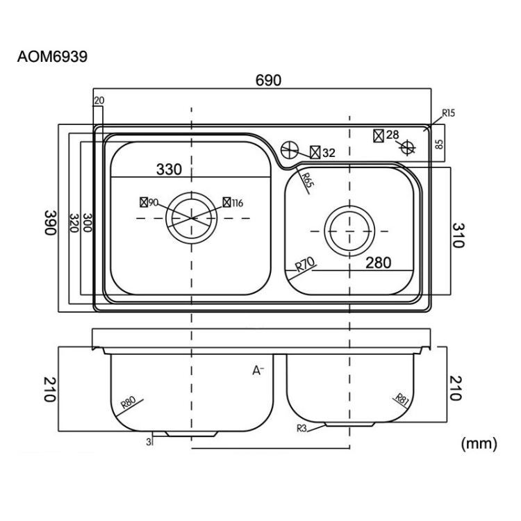 | シンク内寸 | 左側=33*32cm; 右側=28*31cm |