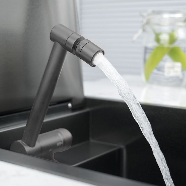 蛇口は90°折畳みと360°回転設計を採用しており、好きな角度に任意調整可能、洗い物やシンクのお掃除などに便利です。
